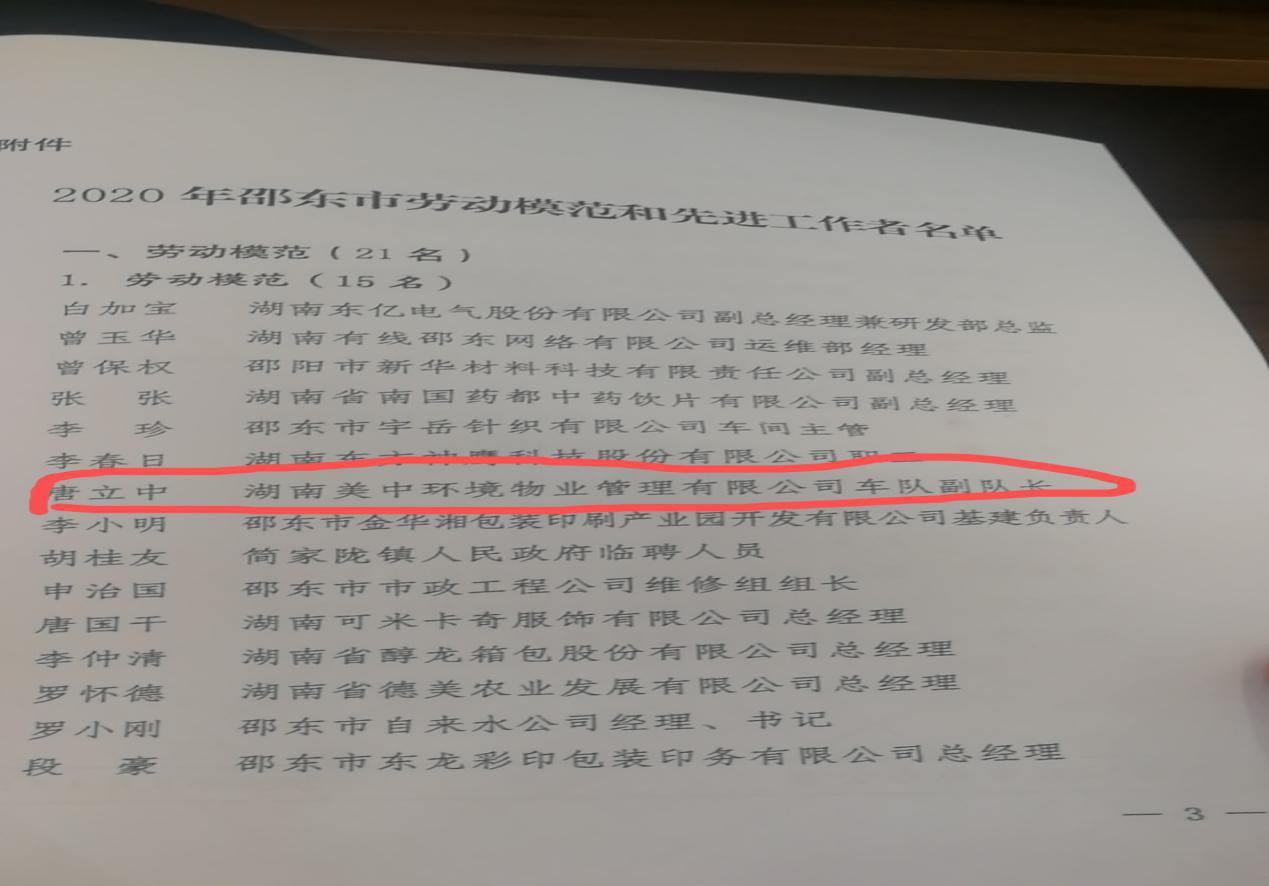 唐立中同志,愛崗敬業,刻苦鉆研。自2016年從一名供銷社的下崗職工成為邵東工人的5年里,頂住世俗眼光,不怕苦,累,臟,刻苦學習環業與管理,任勞任怨,工作突出,從一名保潔員,洗路工步步成為保潔長車隊副隊長。
